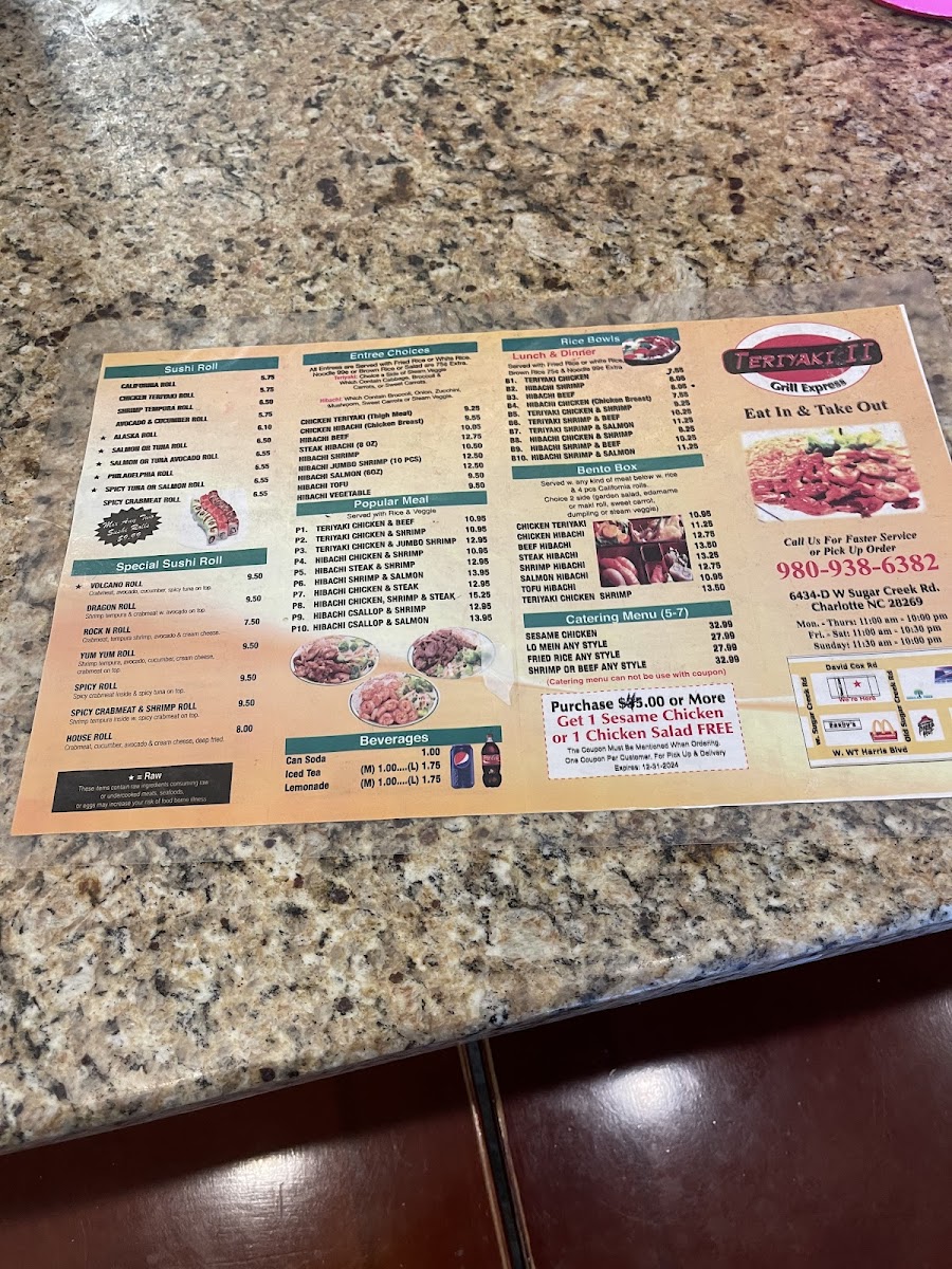 Welcome to Teriyaki Grill Express II, a culinary gem nestled in Charlotte, NC, where appetites meet satisfaction! This vibrant eatery specializes in a mouthwatering array of hibachi and teriyaki dishes, each crafted with fresh ingredients and robust flavors. Notable highlights from the menu include the P6. Hibachi Shrimp & Salmon ($16.50) and the indulgent P7. Hibachi Chicken & Steak ($14.95), both of which promise savory bites that dance on your palate.